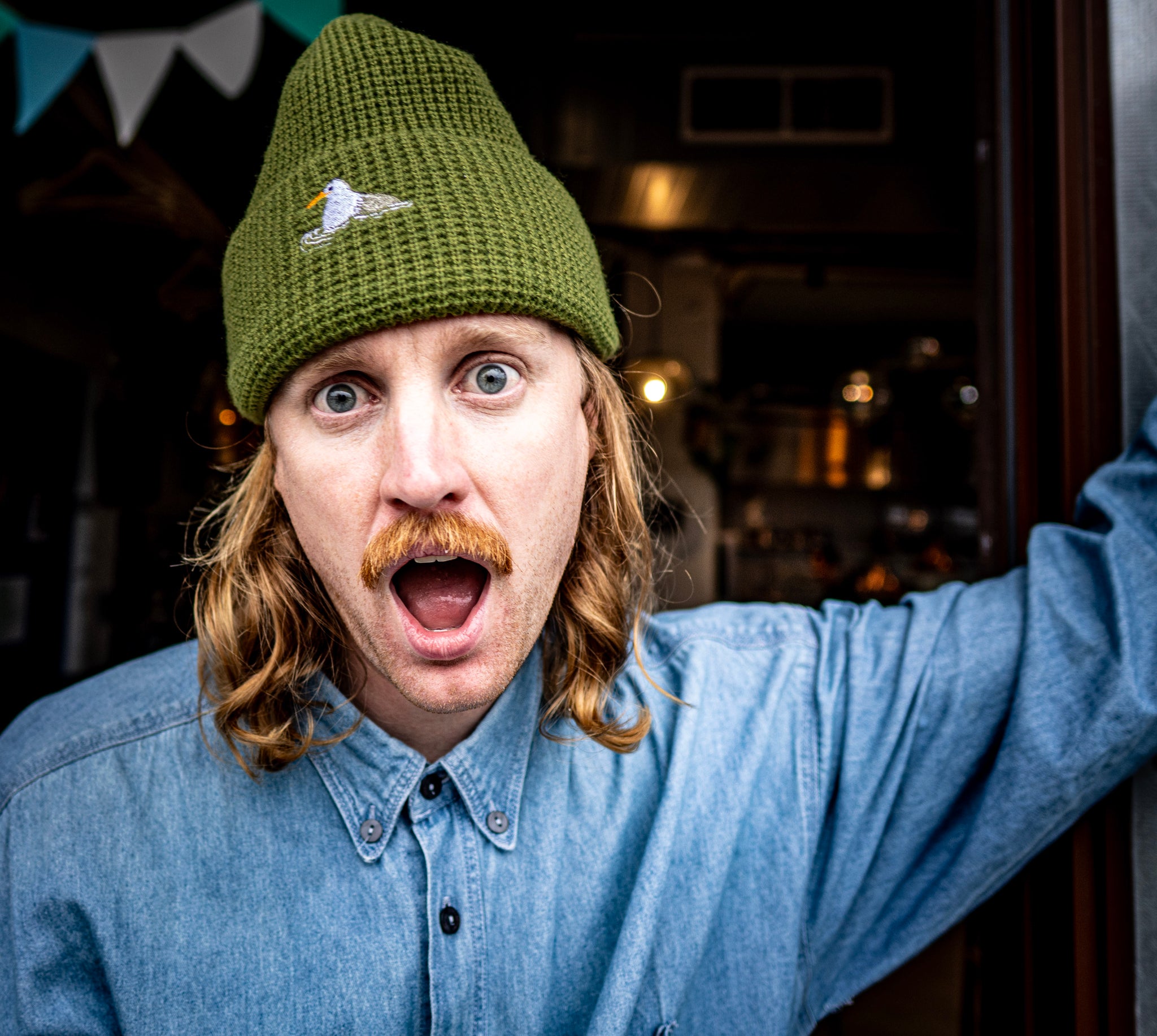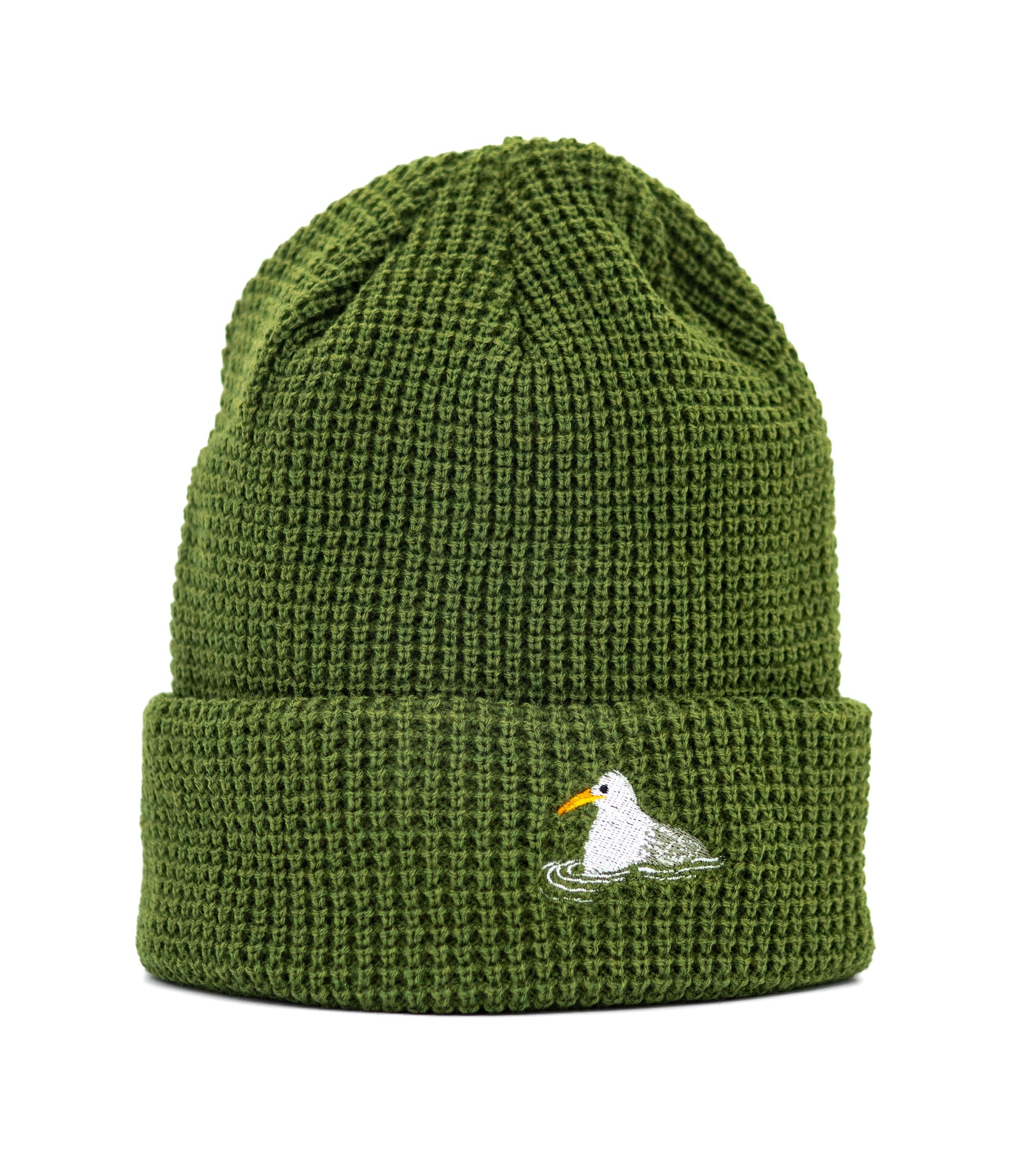 50% r-pet, 50% acrylic one size beanie with embroidered seagull.